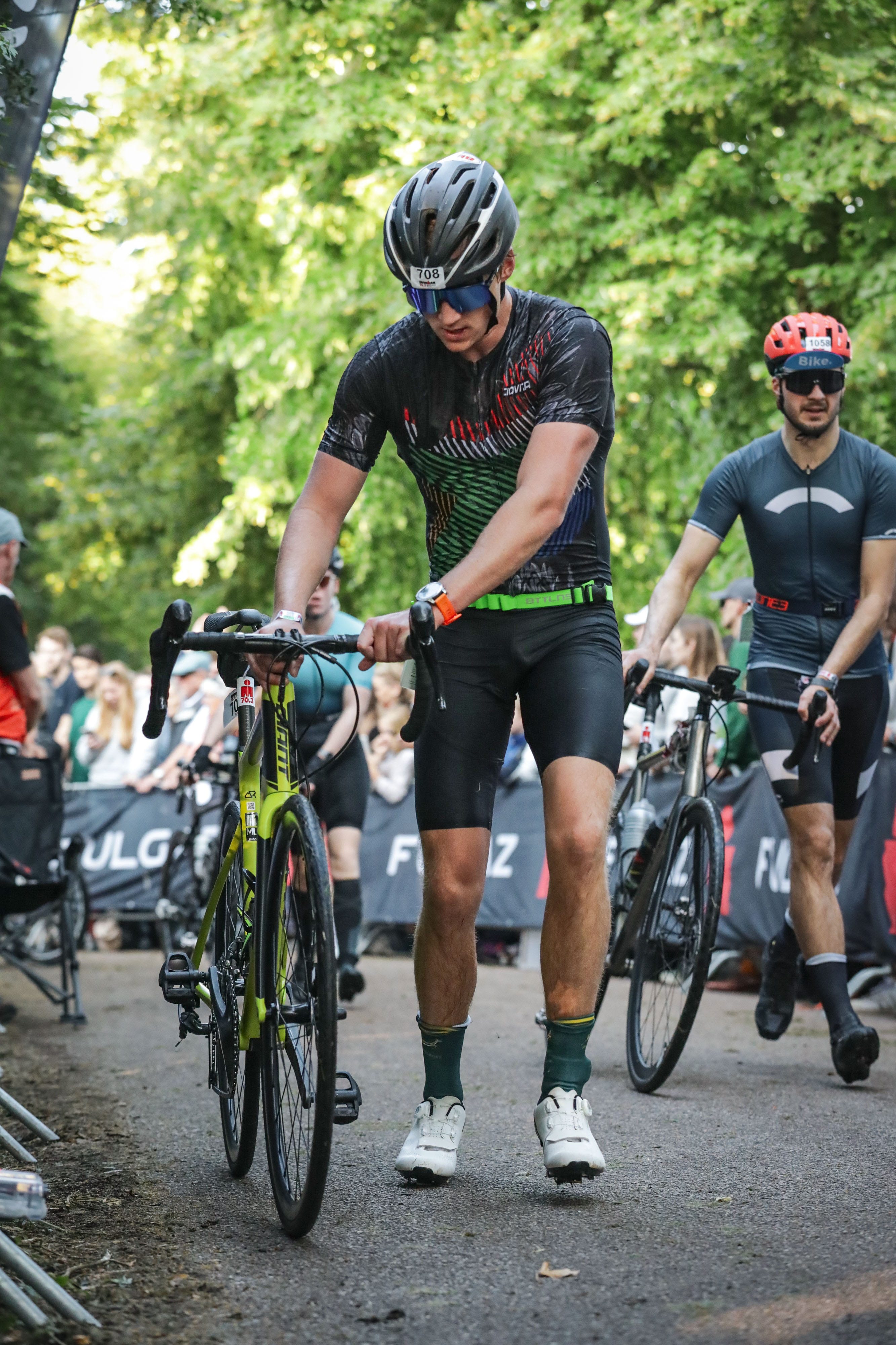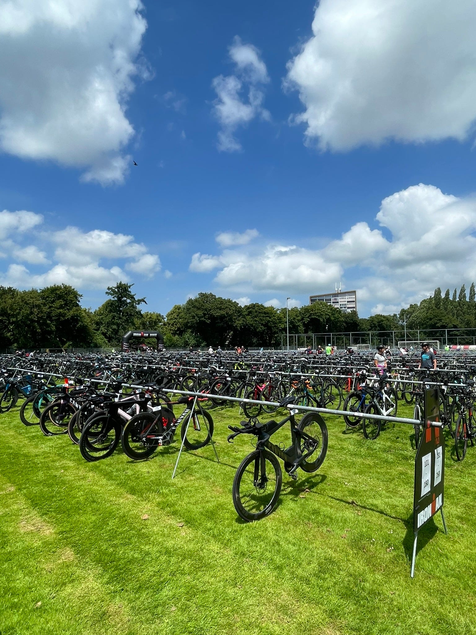 - Once everything is sorted, I put the transition bag back on the hook and run to my bike, being careful not to trip over others in the busy T1 area
