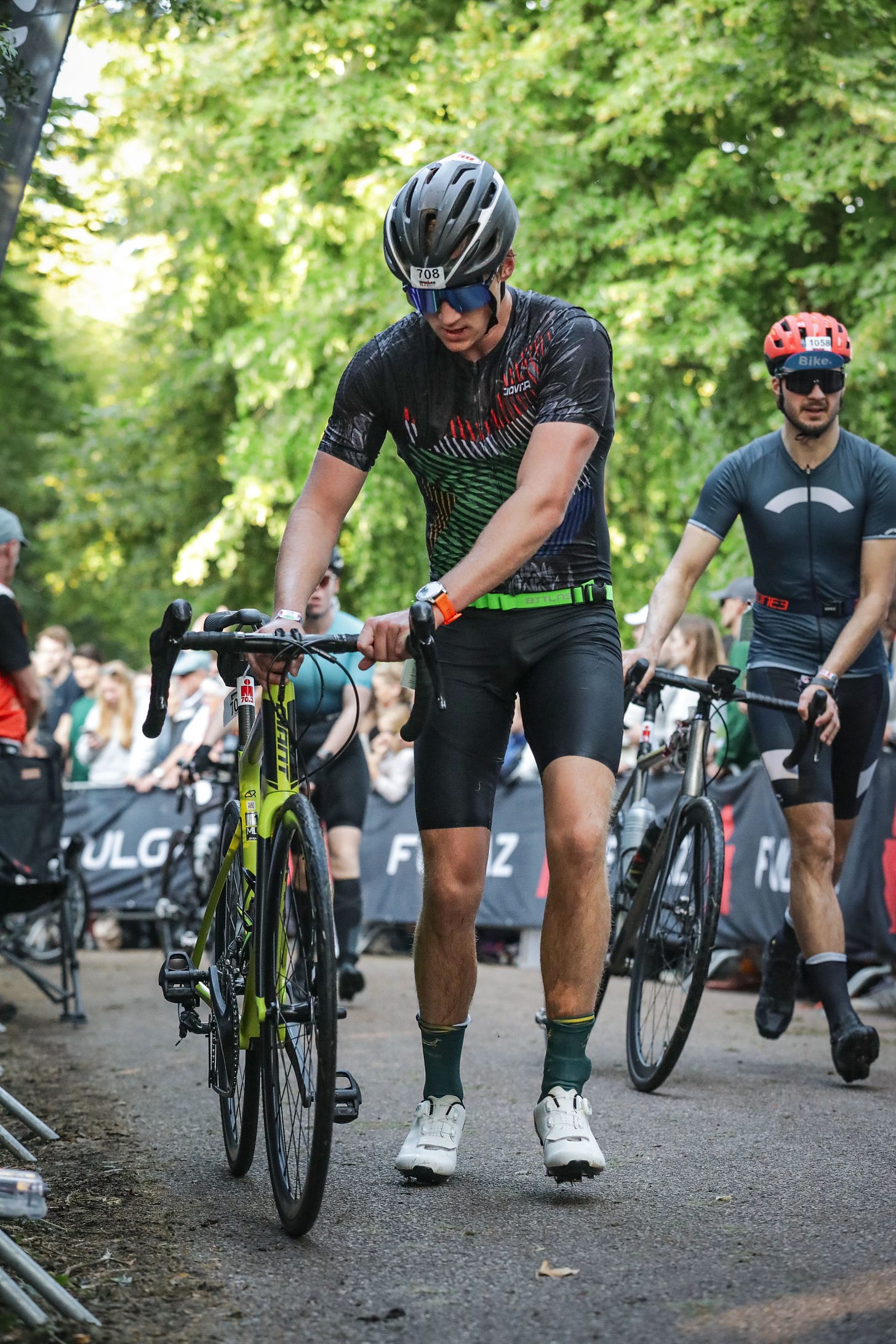 - As I gently (!) run with the bike towards the transition exit, I activate my bike computer
